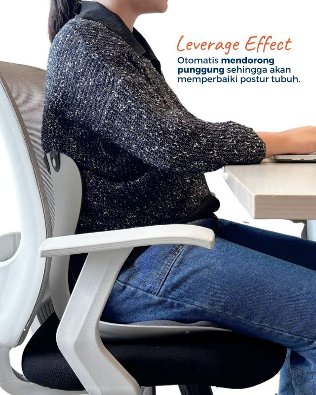 Keunggulannya semakin terasa berkat desain ergonomis yang mampu menahan beban hingga 391 kg, sistem sirkulasi udara yang baik, serta bantalan empuk yang membuat duduk lebih nyaman. Efek leverage dari kursi ini membantu punggung tetap tegak secara alami sehingga Anda bisa beraktivitas lama tanpa rasa pegal.